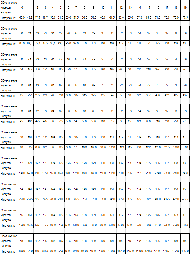 Индекс нагрузки - число в интервале от 0 до 199, однозначно привязанное к нагрузке (в кг), которую может выдержать шина. Как правило в качестве данной характеристики грузовой шины указываются через дробь два числа из данного интервала, что означает способность грузовой шины выдерживать нагрузки в соответствующем диапазоне допустимых нагрузок, измеренных в кг. Всегда предполагается, что при эксплуатации шины будет соблюдена скорость в соответствии с промаркированным на ней индексом скорости (см. ниже). В противном случае нельзя гарантировать соответствие шины данным нагрузкам.