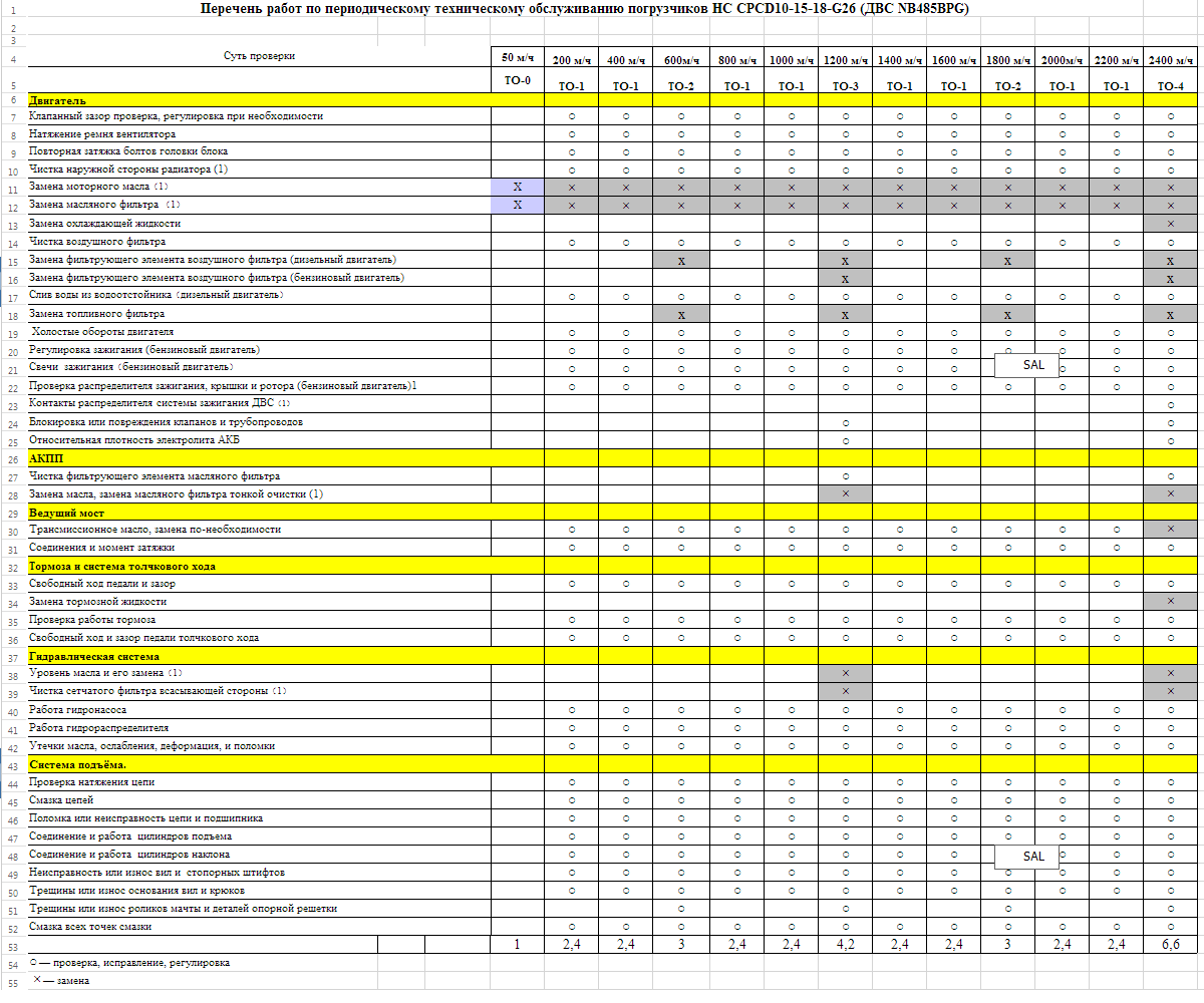 Перечень работ по периодическому техническому обслуживанию погрузчиков HC CPCD10-15-18-G26 (ДВС NB485BPG)