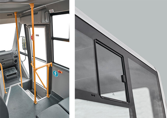 Двери: передняя дверь обладает электромеханическим приводом, а управлять ей можно при помощи кнопки на панели приборов водителя. Дверь можно открыть и снаружи, нажатием специальной кнопки. Задняя дверь открывается вручную, ее можно считать запасной. Установлен ременный ограничитель, предотвращающий открывание двери.