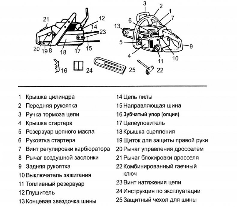 Топливный насос, Поворотный замок, Тормоз цепи, Пильная цепь Oilomatic, Направляющая шина, Натяжитель передней цепи, Натяжитель боковой цепи, Регулировочный натяжитель, Звездочка цепи, Крышка звездочки цепи, Шип бампера, Цепь ловитель, декомпрессионный клапан, глушитель, рукоятка стартера, клемма свечи зажигания, крышка заливной горловины масла, крышка топливного бака, главный рычаг управления, блокировка курка дроссельной заслонки, курок дроссельной заслонки, передняя рукоятка, передний защитный кожух, задняя рукоятка, задний защитный кожух.