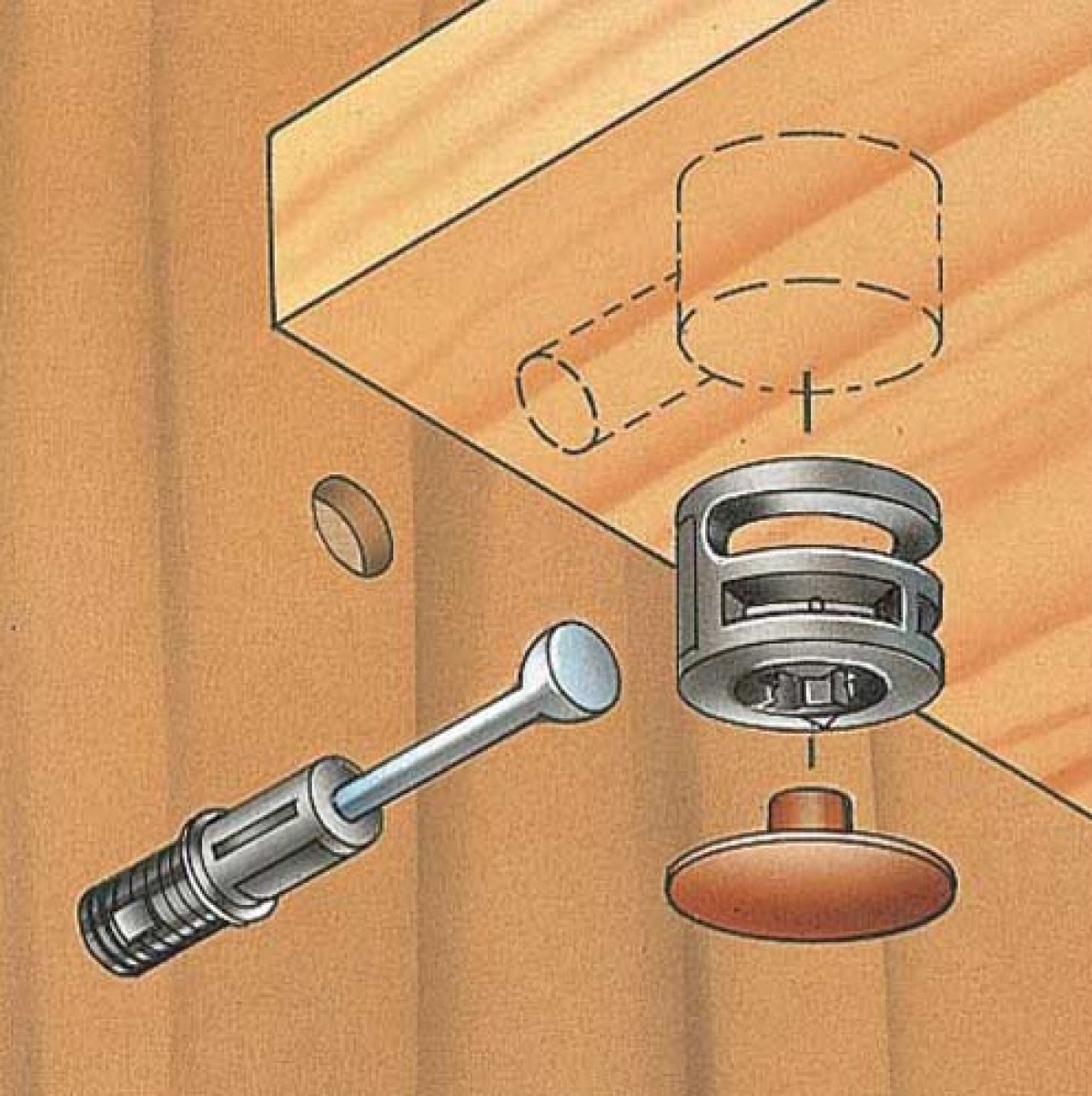 Конусная стяжка представляет собой усовершенствованный вариант винтовых креплений. Чтобы скрыть резьбовую заглушку на лицевой стороне панели в коническом соединении, винт заменили стержнем.