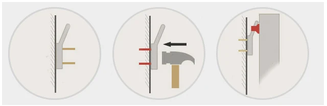 - Крючок-паучок — вариант крепления, напоминающий паука. Крючок из пластика удерживается на стене четырьмя гвоздиками из стали с острыми концами. Их можно вбить почти в любой материал обычным молотком. Для этого к стене прикладывают крючок стороной, на которой находятся крепления, а потом осторожно ударяют молотком, чтобы не сломать пластик. Металлические стержни входят в стену и прочно фиксируют крючок.