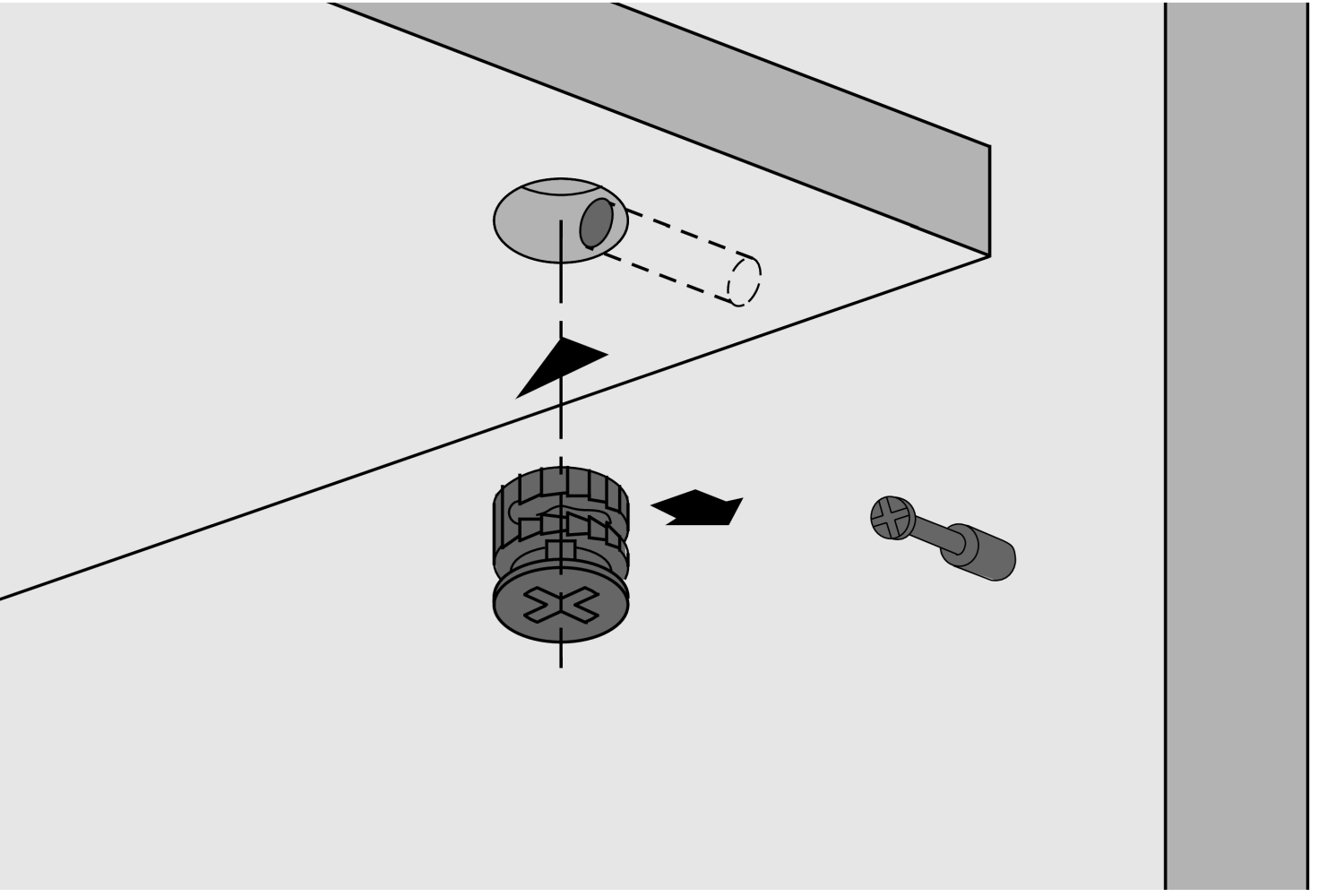 - 1 этап. Дюбель (или дюбель и футорка) устанавливается в подготовленное отверстие в пласти первой мебельной детали.