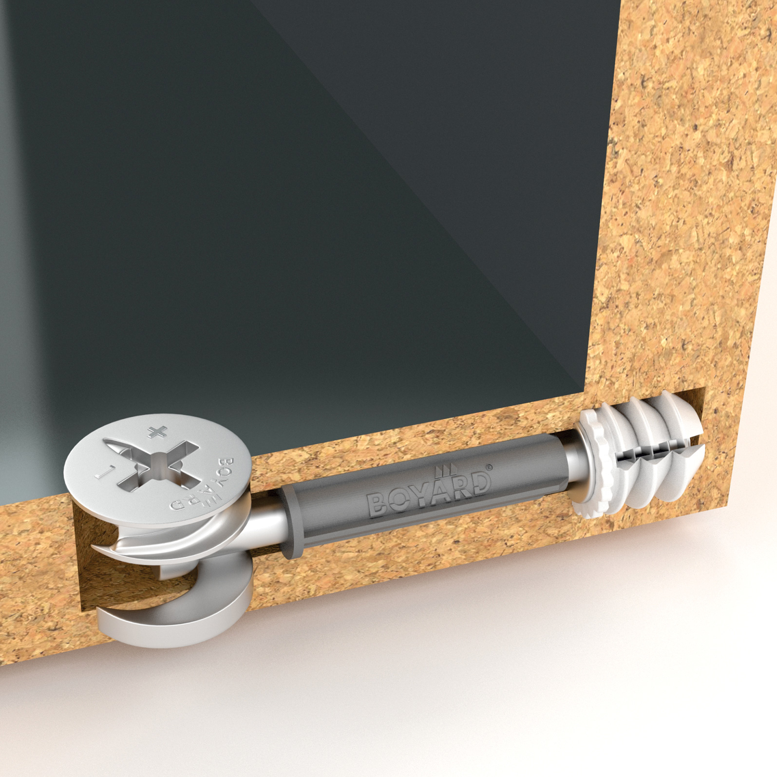 - 3 этап. При повороте эксцентрика его внутренняя поверхность захватывает головку дюбеля и происходит прочное соединение двух деталей между собой.