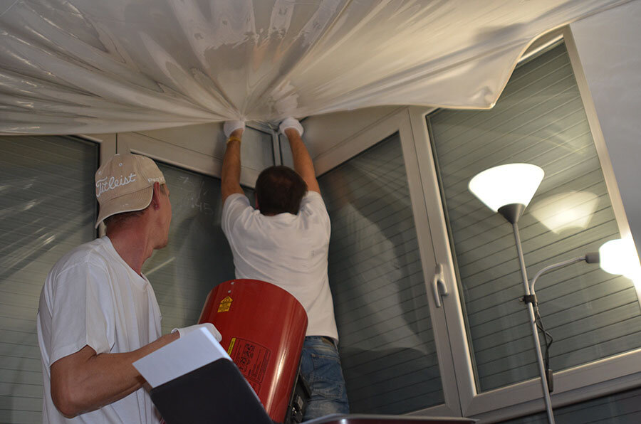 Помещение стоит закрыть и нагреть воздух в нем до 40 градусов. Это нужно делать прежде, чем полотно будет вытащено из упаковки.