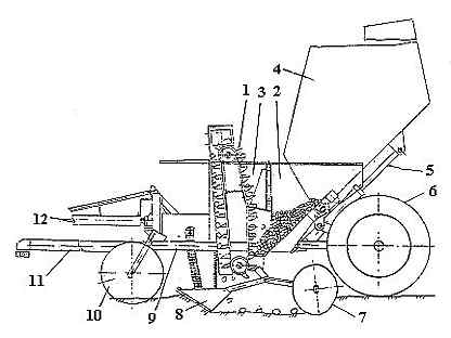 - Основа механизма — конвейер (1) для подачи клубней в грунт. Представляет собой цепь прикрепленными ковшеобразными захватами, расположенными через равные промежутки. Расстояние между ковшами определяет плотность посадки в ряду.