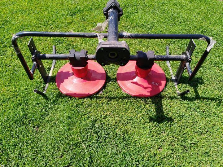 Вращение дисков косилки происходит вовнутрь, в результате чего трава укладывается в валки. Косилка приводится в рабочие состояние при помощи натяжного устройства, которое, посредством ремня, передает крутящий момент от шкива двигателя мотоблока к косилке. Натяжное устройство входит в комплект.