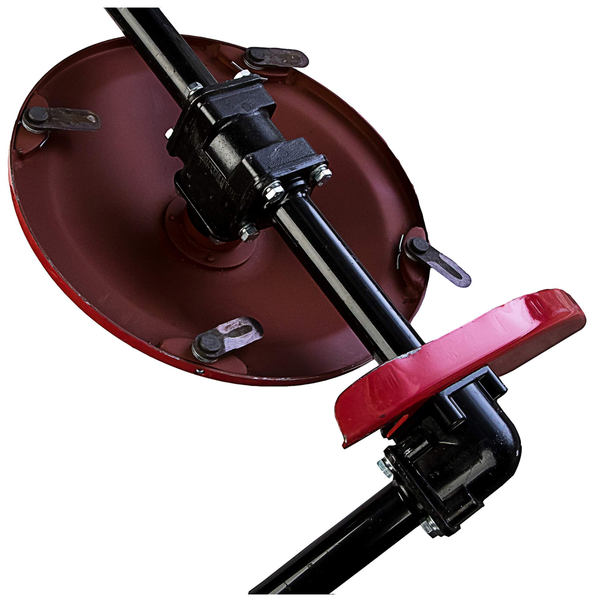 Крепится путем надевания на штатный штырь находящийся спереди мотоблока. Скорость вращения дисков регулируется оборотами двигателя. На каждом из двух дисков размещено по четыре ножа, свободно вращающихся вокруг своей оси. При вращении дисков, за счет центробежной силы ножи становятся в рабочее положение, и происходит кошение травы.