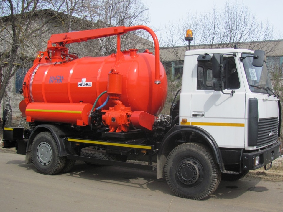 Специальное оборудование состоит из цистерны, водяного насоса с приводом, барабана с намотанным рукавом, гидравлической системы и вспомогательного дополнительного оборудования. Очистка осадка производится водяными струями высокого давления. К машине прилагается набор размывочных головок, которые применяют в зависимости от диаметра очищаемых труб и степени их засоренности. Размывочная головка под действием реактивной силы движется вперед по трубе и размывает осадок водой под давлением 160 атм.Для механического забора, перевозки и слива жидких и фекальных отходов, не содержащих взрывчатых и горючих веществ, компания «Спецтехника» предлагает машину КО-523 на шасси МАЗ-533702. Заполнение цистерны вместимостью 8,3 м3 происходит под действием вакуума, создаваемого вакуумным насосом производительностью 730 куб.м за 7 минут. Опорожнение цистерны осуществляется самотеком (6 минут) или под действием давления воздуха от вакуумного насоса (тогда процесс занимает не более 3 минут). Специальное оборудование состоит из двух цистерн, вакуумного насоса с вакуумно-нагнетательной системой, приемного лючка с всасывающим шлангом, специального предохранительного устройства, кранов управления с трубопроводом.