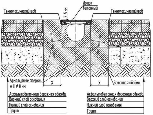 - для зон классом нагрузки А15–В125 – возможно упрощенная схема, с неполным бетонированием обоймы (не на всю высоту стенок лотка и без гравийной подсыпки), учитывая размеры примыкающего покрытия (рис. 4а)