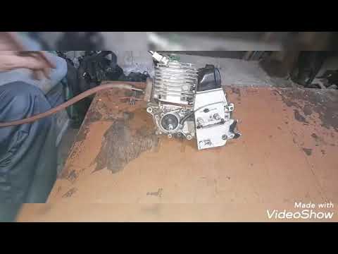 Положите бензопилу горизонтально и потяните шнур стартера, чтобы проверить его на сжатие. Попробуй выкрутить свечу, чтобы проветрить цилиндр.