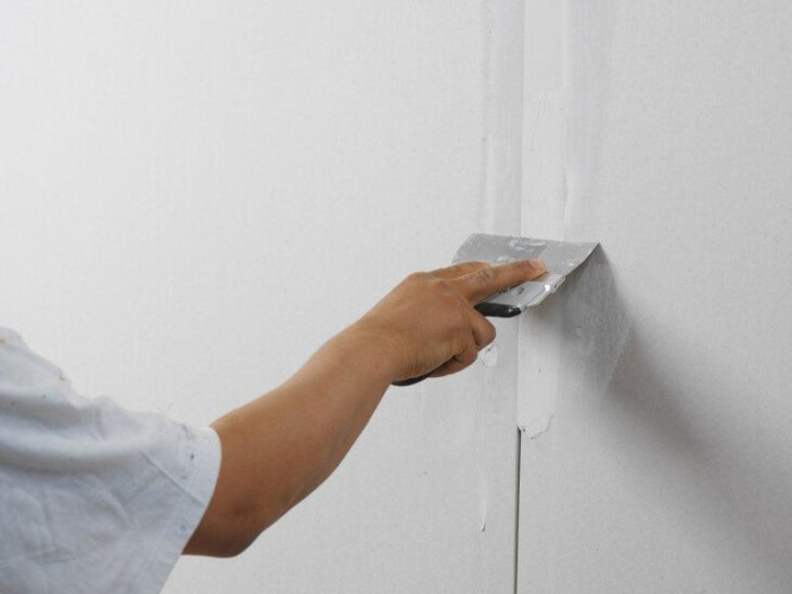 - В первую очередь необходимо заделать швы ГВЛ . Нанесите первый слой шпаклевки используя ленту, которая обустраивается под составом на швах.