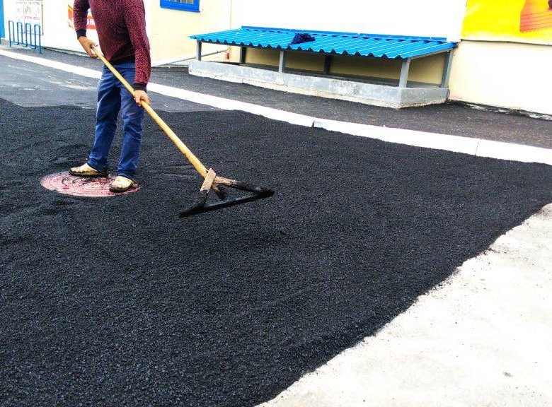 Территория, на которую планируется укладывать асфальт, предварительно высушивается при помощи специальной техники.