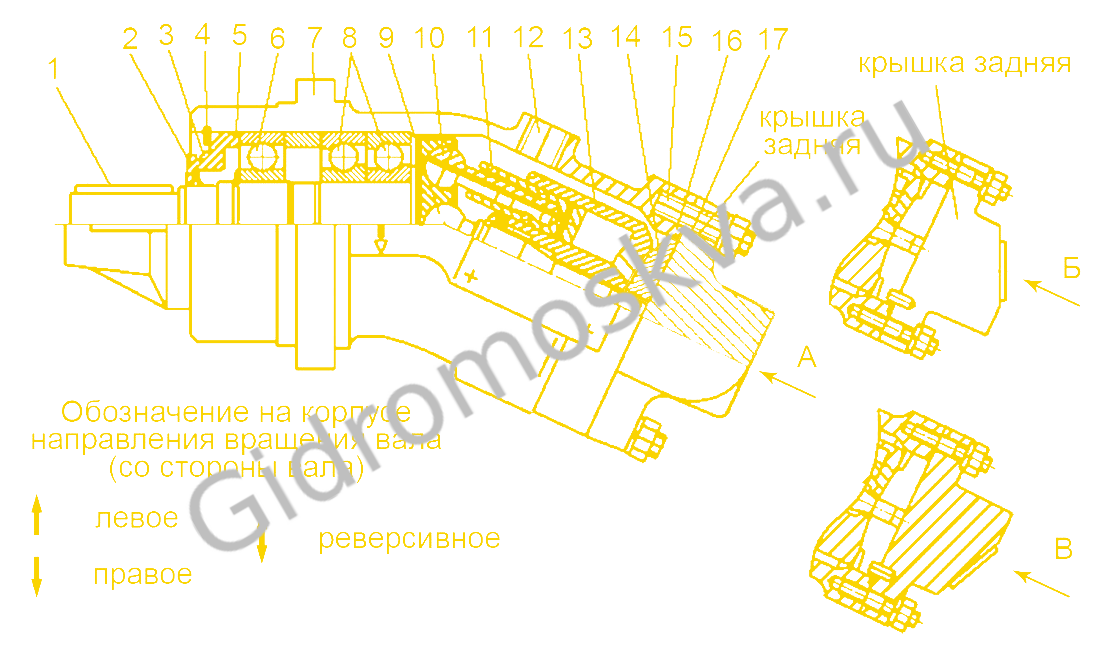 1. Приводной вал с блоком цилиндров – Вращающийся элемент насоса, в котором установлен блок цилиндров с валом.