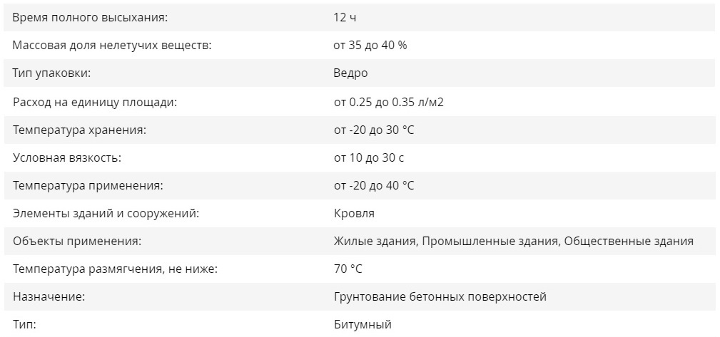Тип мастики — для приклеивания слоев кровли. Этим объясняется ее небольшой расход на кв.м — до 2 кг. Состав может использоваться при минусе при условии, что сама битумная мастика будет комнатной температуры.