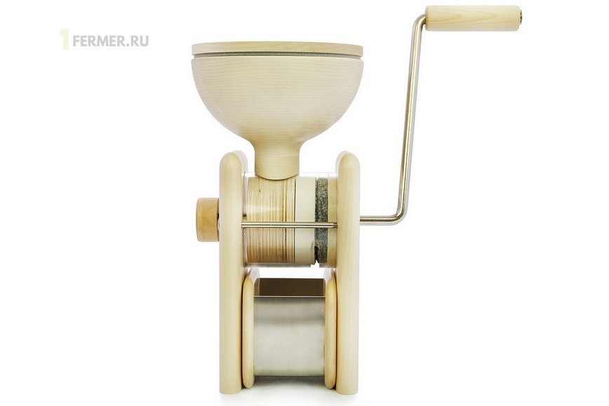 — Простота конструкції. Жорна, виконані у вигляді роликів, виготовлених з харчової сталі, приводяться в дію за допомогою рукоятки. Завдяки простоті конструкції з керуванням цієї міні-млини без проблем впорається як досвідчений у цій справі людина, так і новачок.