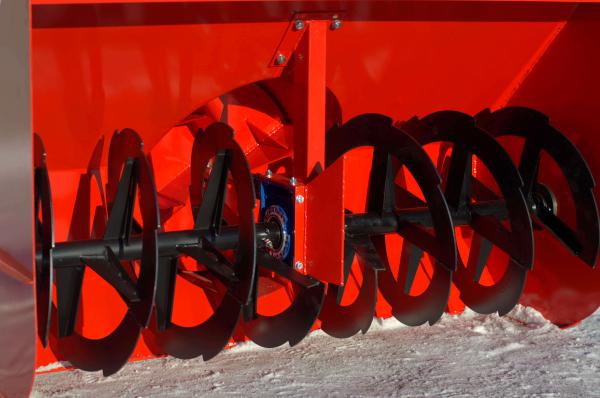 - Одноступенчатый . Оснащен одним винтом в виде спирально расположенных ножей. Спиральные ножи состоят из двух частей и сходятся в центре, где расположены метательные лопатки. При движении механизма ковш срезает слой снега, который тут же попадает под вращающиеся ножи. Последняя дробила снег и перемещала его в центральную часть корпуса. Поскольку лопасти расположены в центре шнека, они захватывают измельченный снег и выбрасывают его в насадку, установленную в задней части ковша. Чем выше скорость вращения вала с лопастями, тем дальше отбрасывается снег. Ножи шнека могут быть как с ровным лезвием, так и с зубчатым. Ножи с гладким краем используются для уборки свежевыпавшего снега, часто изготавливаются из конвейерной ленты.