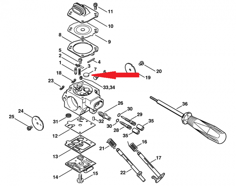 Карбюратор бензопилы. Стрелка — тросик рычага привода дроссельной заслонки.
