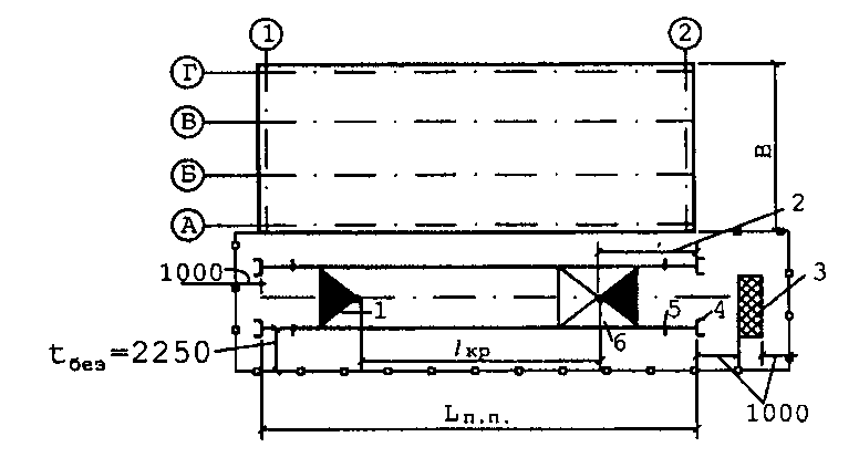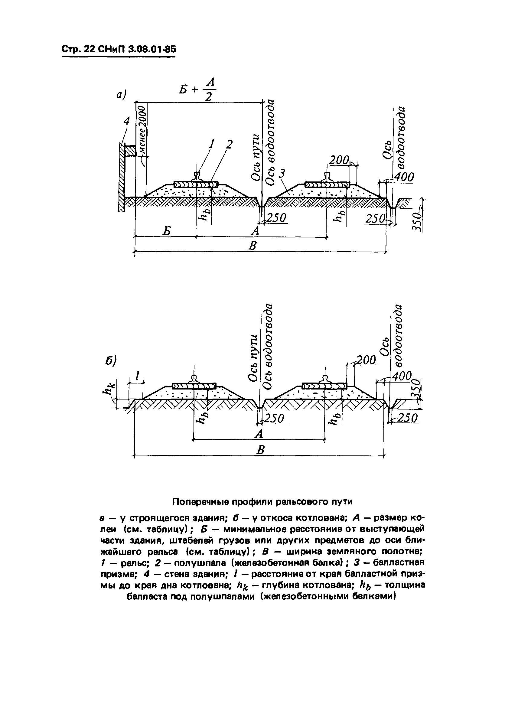 1 — полушпалы; 2 — рельсы; 3 — балластная призма; 4 — расстояние от оси первого рельса до выступающей части здания