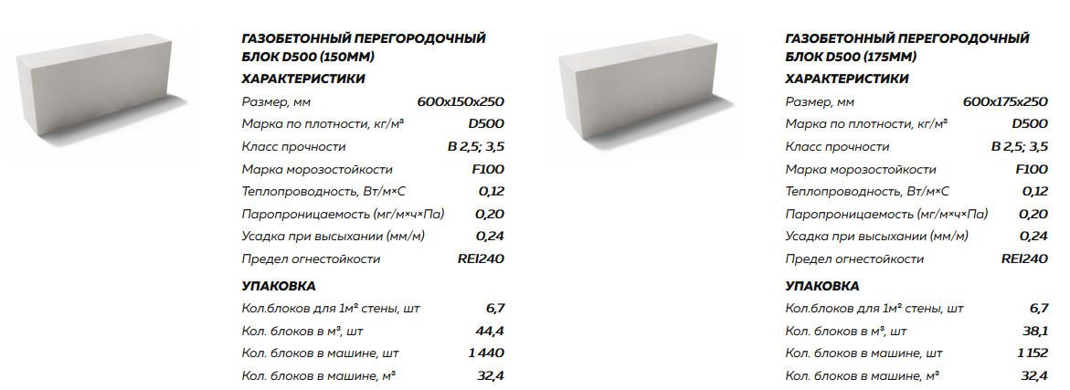 | Перегородочный | D400 | Aerostone | 625×100×250 | 64 | 3400 |