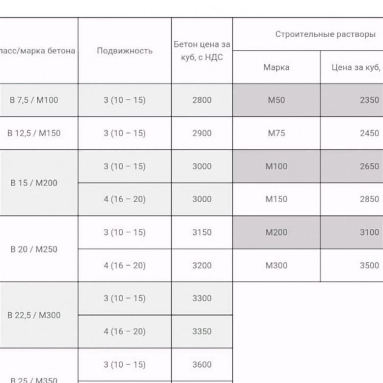 - М100 (В7.5) — 2494 (кг), М150 (В12) — 2360 (кг), М200 (В15) — 2432 (кг), М250 (В20) — 2348 (кг), М300 (В22.5) — 2502 (кг), М350 (В25) — 2502 (кг), М400 (В30) — 2376 (кг), М500 (В40) — 2298 (кг).