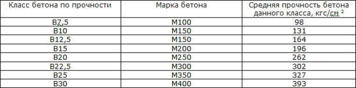 Вес 1 (м3) бетона разных марок, в скобках указан соответствующий марке бетона класс прочности:
